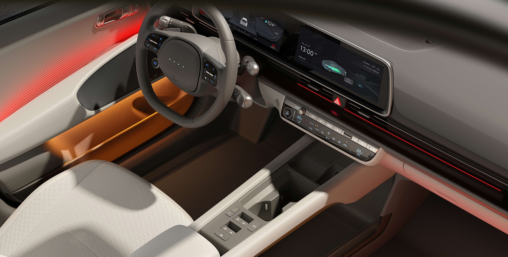 Set the ambience of the interior with Dual Color Ambient Lighting’s overall illumination for IONIQ 6. Select from 64 color options each for top and bottom tier to compose your mood light settings. Enrich your driving experience with psychological effects from 6 dual color themes recommended by color experts.